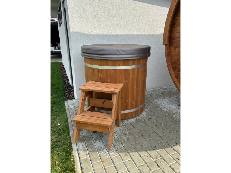 Součástí zakázky byla i výroba ochlazovacího sudu z Thermowoodu s plastovou vložkou, izolací, poklopem a schůdky.