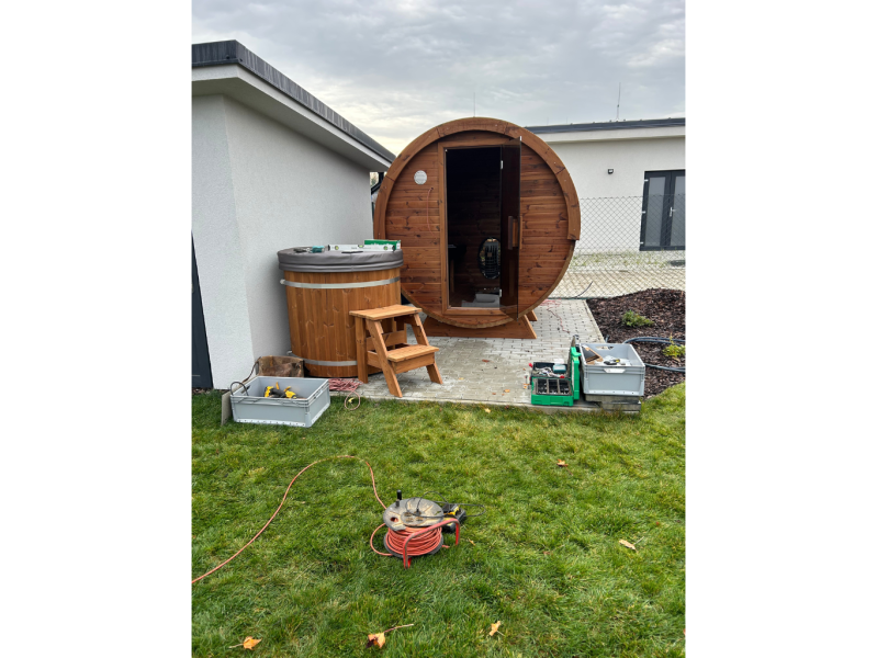 Výrobu této sudové sauny jsme domluvili poměrně rychle a na dálku. Všechno začalo objednávkou sauny přímo na e-shopu. Potom jsme si se zákazníkem vyměnili několik e-mailů a detaily jsme probrali po telefonu. Naživo jsme se potkali až při realizaci.